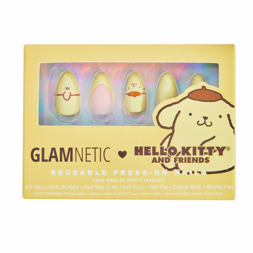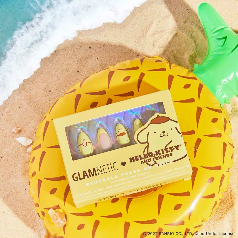 Take your summer adventures to new levels of cuteness with our exclusive Hello Kittyยฎ and Friends collaboration! The Pompompurin Press-On Nail Kit comes in a short almond shape, and features a versatile, soft yellow hue with adorable graphics of your fave golden retriever pup, and accent nails with matching french tip designs. Too cute to handle!