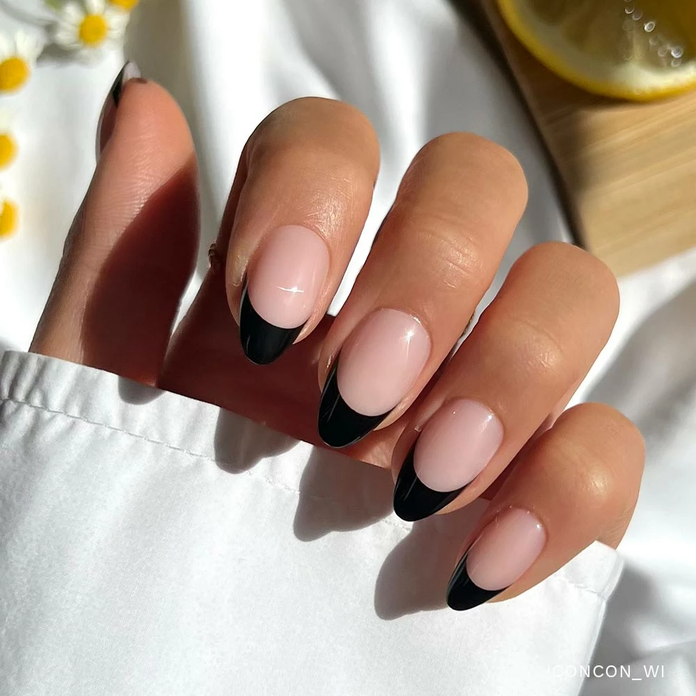 Caviar: a short almond style featuring of-the-moment jet black french tips on a semi-transparent base.