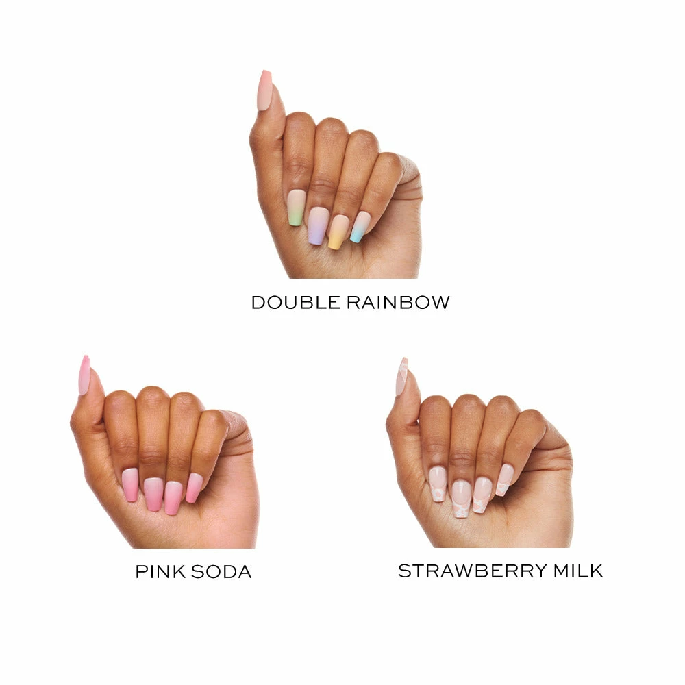 Look at these Trend Setters! All three of these new Nailcation nails are super on-trend; Pink Soda with its hot pink ombre, Double Rainbow with a stunning matte finish, and Strawberry Milk’s sweet pink cow tips. These nails are so quick and easy to put on, you’ll have trendy nails in no time.ย